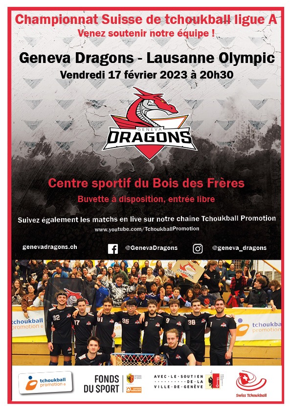 Vendredi 17 février les « Geneva Dragons » affrontent « Lausanne Olympic » dans le cadre de la Ligue A du Championnat Suisse de Tchoukball !
