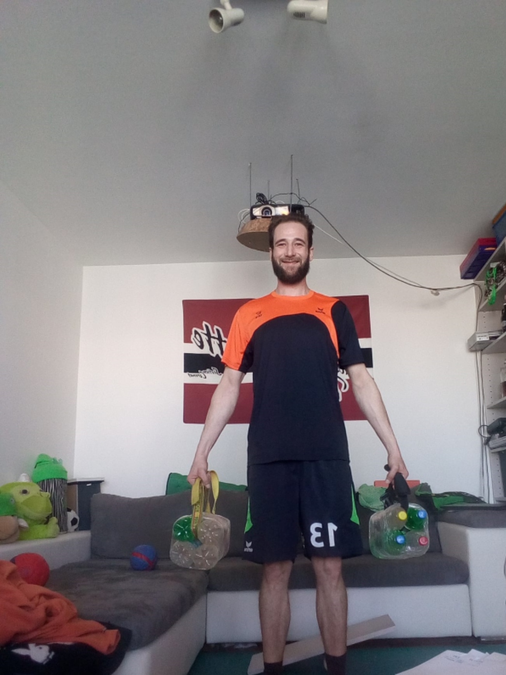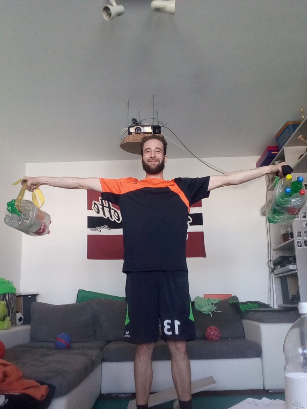 Matériel: 1 à 4 bouteilles PET liées avec du film alimentaire (en fonction de ton âge), 1 ceinture et 1 lanière de sac.