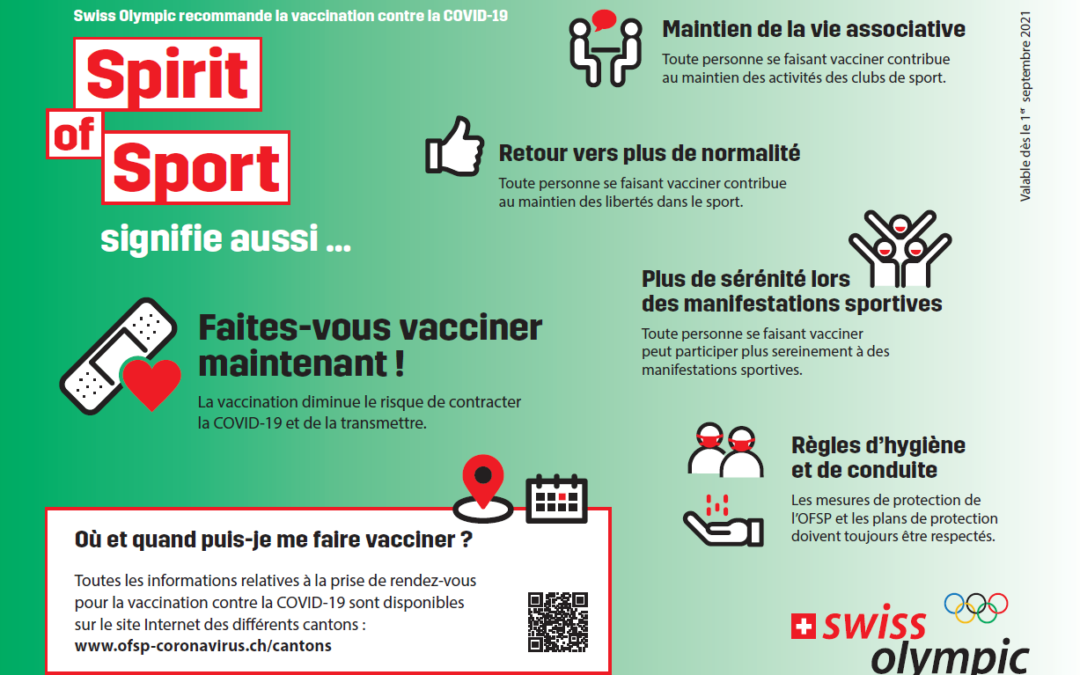 En collaboration avec Swiss Olympic nous soutenons ainsi activement la campagne de vaccination de l’Office fédéral de la santé publique.