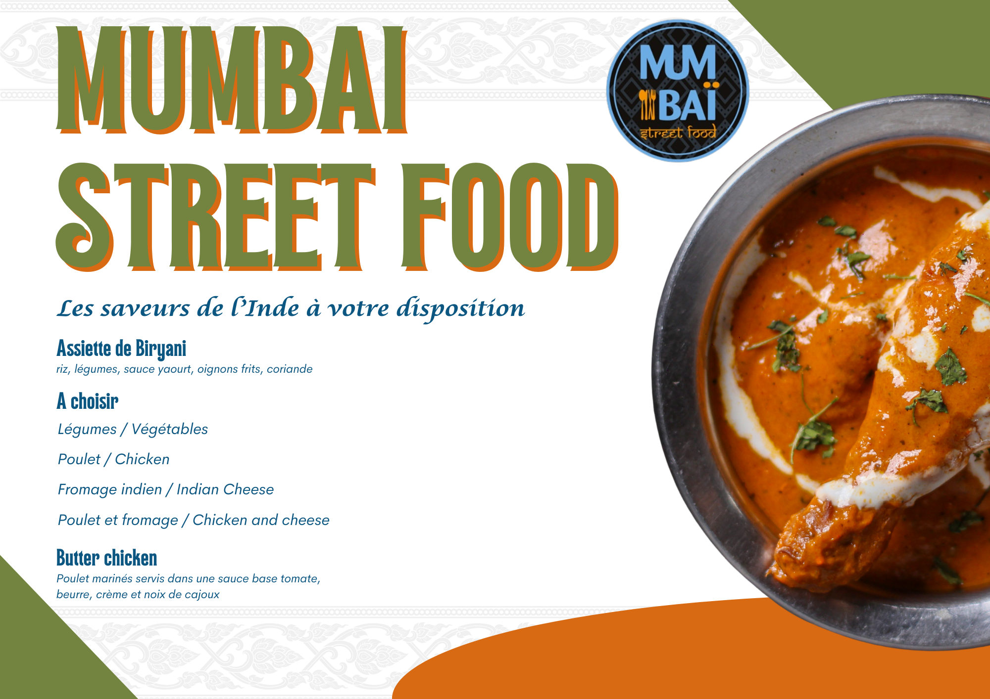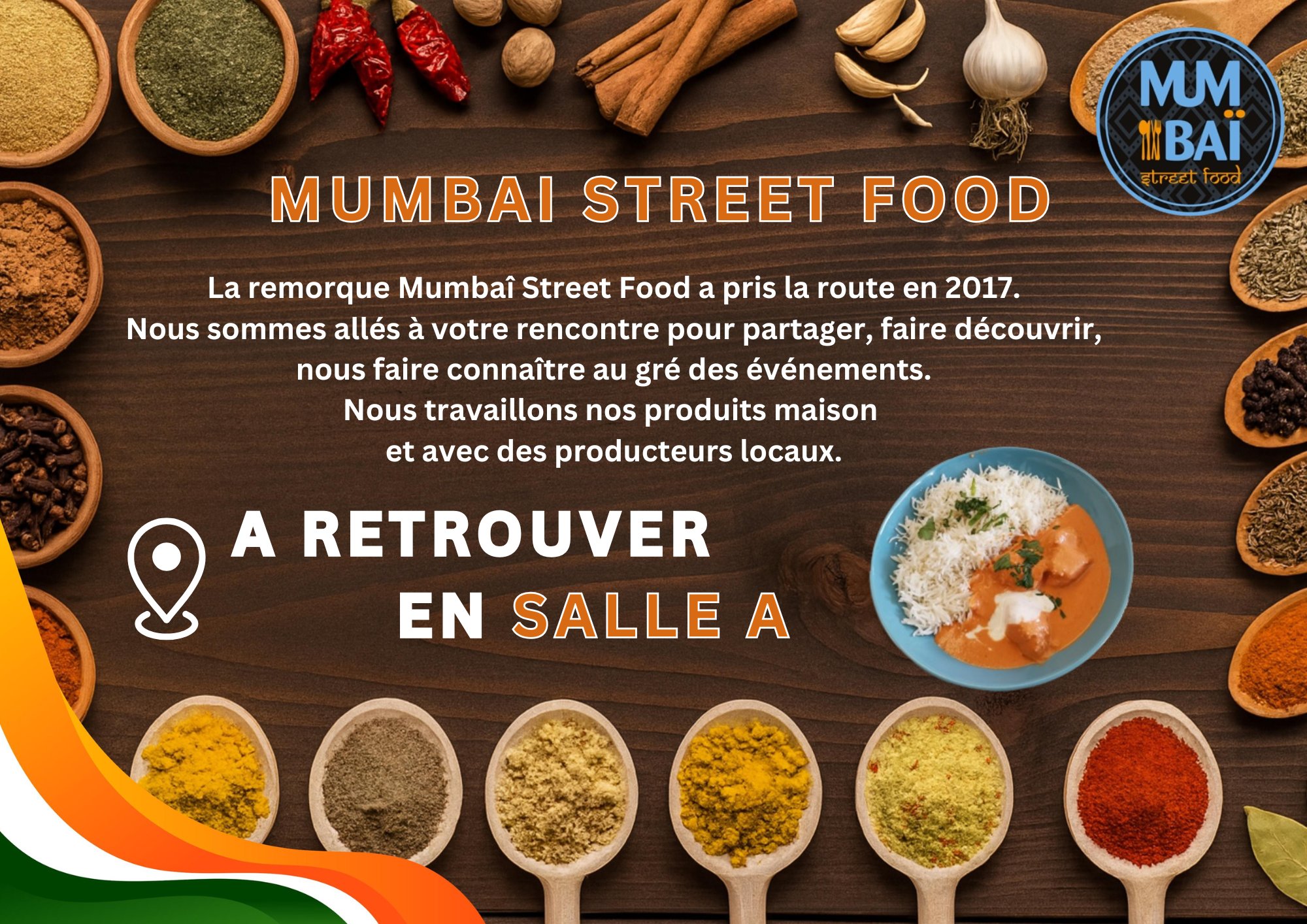 L’inde vient à vous avec une cuisine faite maison, préparée avec des producteurs locaux. Riz biryani ou bien butter chicken, Mumbai street food va vous faire voyager sans modération !