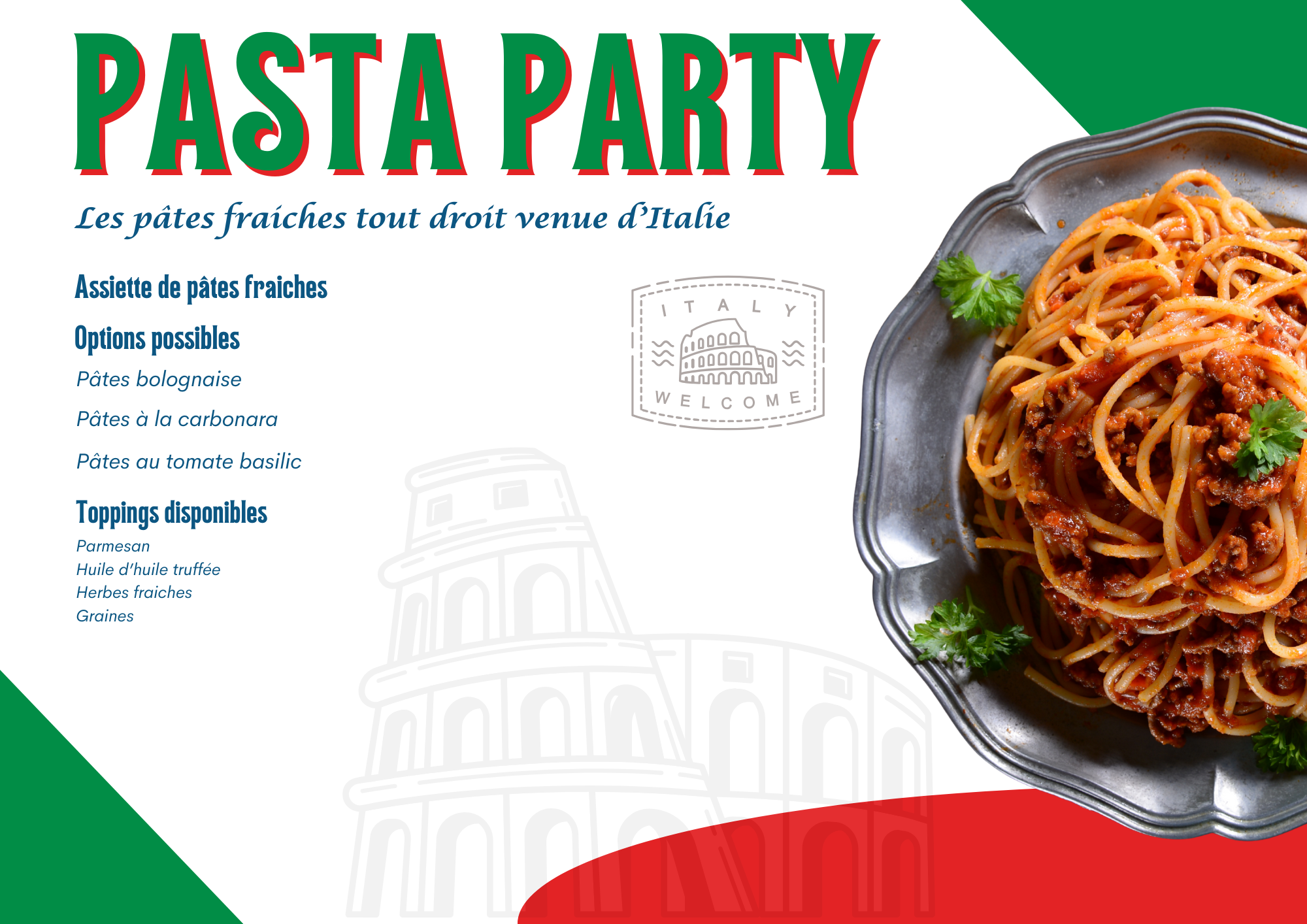 Une assiette de pâte, des sauces gourmandes et des toppings en option : parmesan frais, huile d’olive, herbes italiennes… compose ta création et régale-toi !