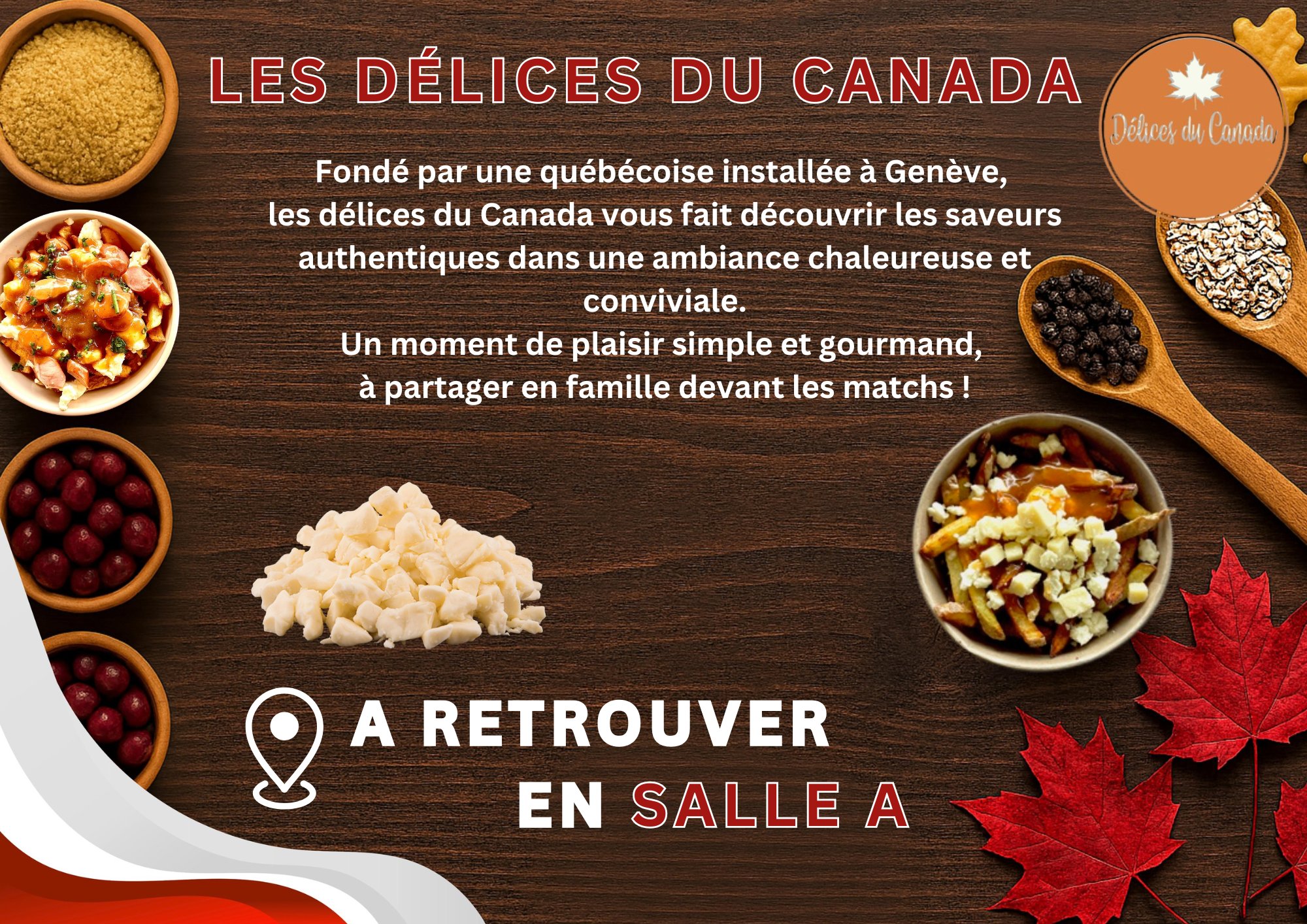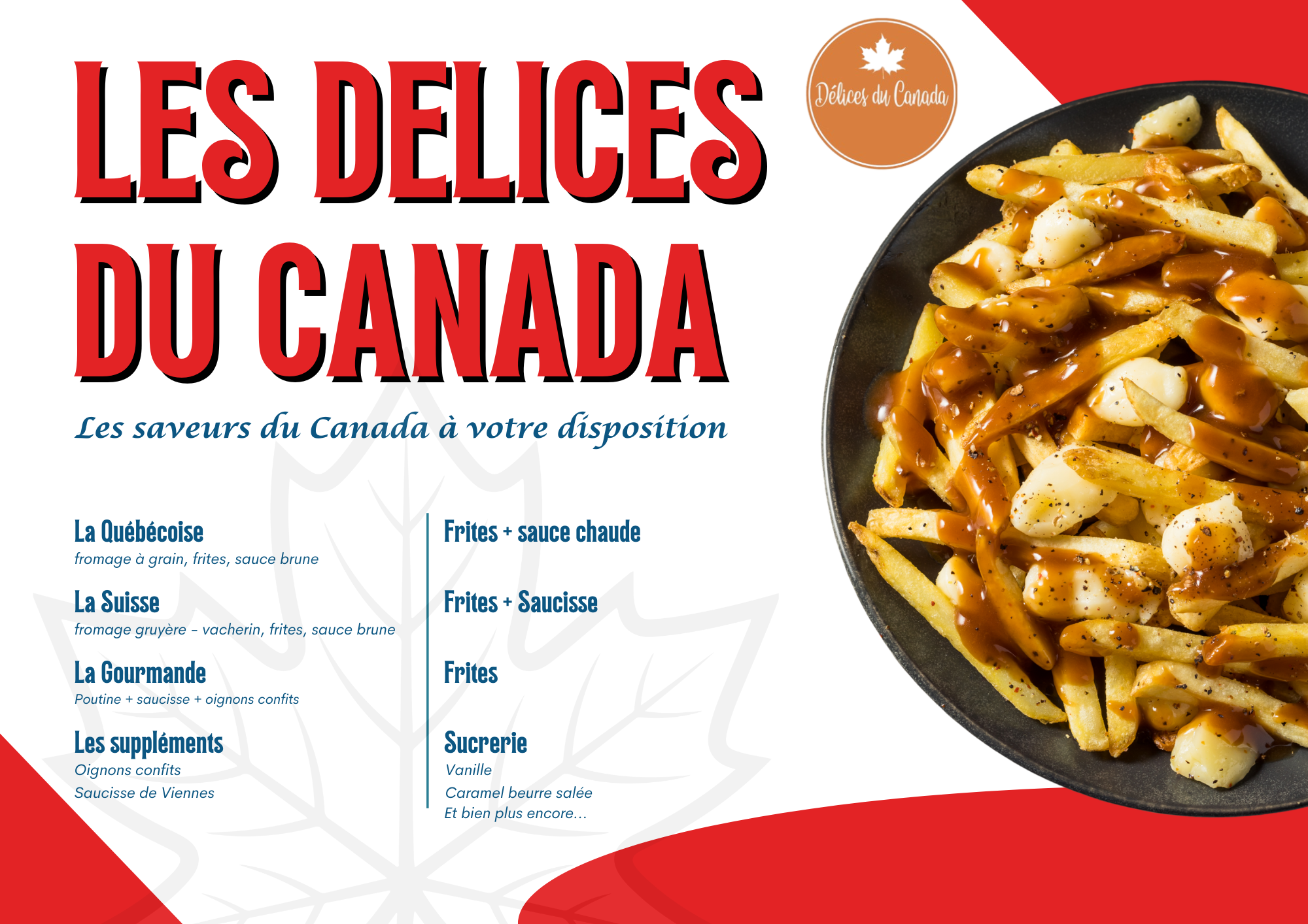 Dégustez la célèbre poutine maison : frites fraîches, sauce bune et fromage en grains, avec de délicieux suppléments. Laissez vous tenter par une petite sucrerie en dessert : sucette à l’érable, guimauves chocolatées et bien d’autres !