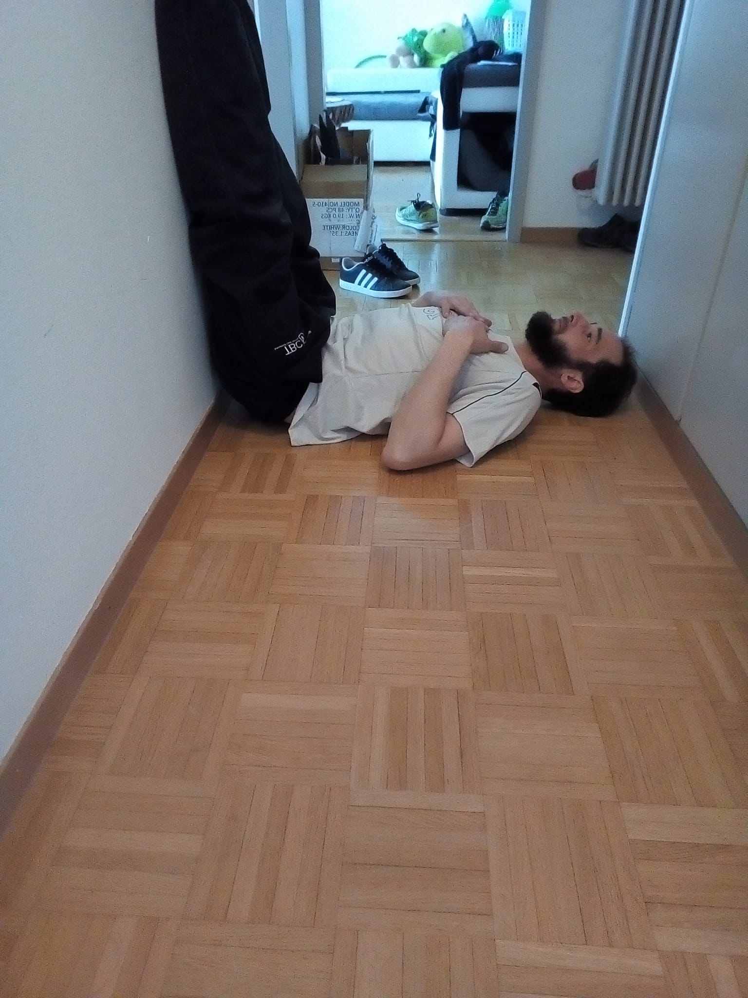 Pour réaliser cet exercices il faut se positionner en « L », dos contre le sol et les jambes à la verticale contre le mur. Pour ce faire placer vous coucher sur le coté les tallons et les fesses collés au mur, puis exécuté une rotation sur vous même pour vous retrouver couché sur le dos les jambes en l’air. Attention le dos doit bien plaquer au sol, soyez attentif à ne pas cambrer.
