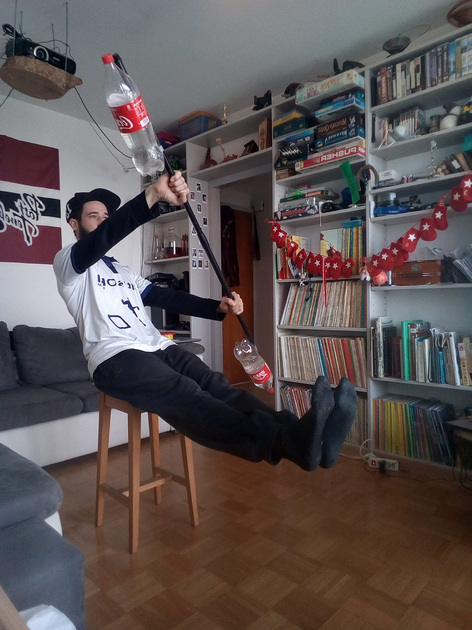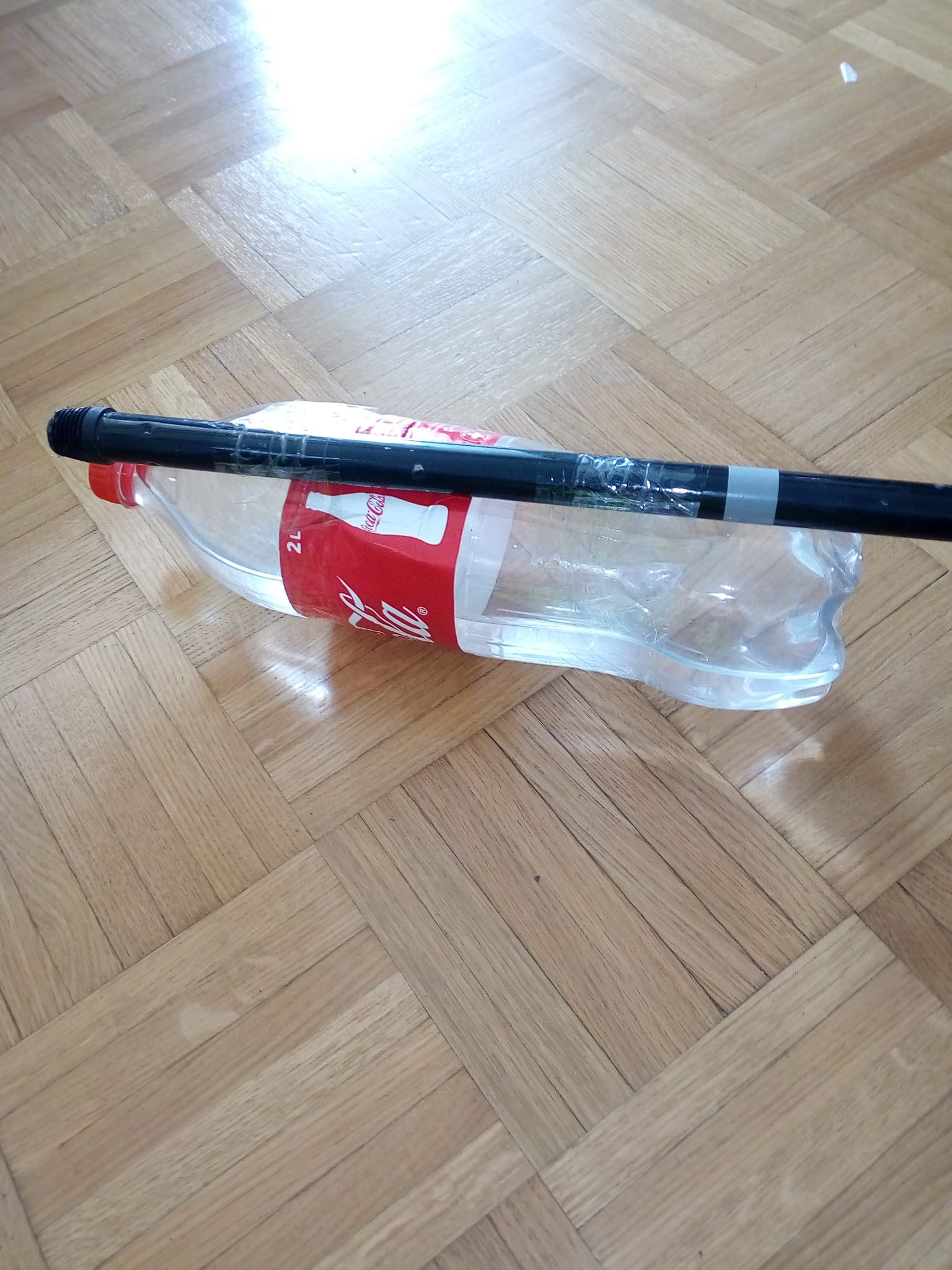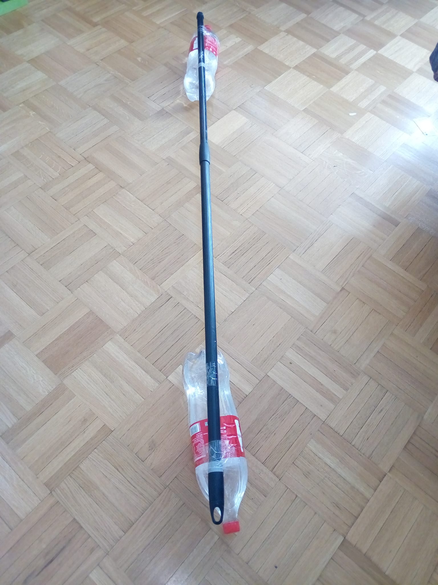 Matériel: Un manche à balais, du scotch, des bouteilles PET